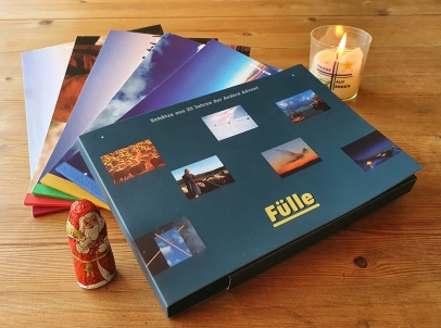 Während der Adventskalender „Der Andere Advent“ im DinA4-Format erscheint, hat sich das Redaktionsteam im Fall der Best of-Sammlung für das kleinere DinA5-Format entschieden. Herausgekommen ist ein verschließbarer Schuber mit fünf Broschüren im Querformat, die inhaltlich durch die Advents- und Weihnachtszeit führen. Unter dem Titel „FÜLLE. Schätze aus 25 Jahren Der Andere Advent“ bietet die Sammlung 70 Beiträge aus 25 Adventskalendern – darunter Morgensterns Gedanken zum Meer, eine Erzählung über Einsteins Weltformel oder die berührende Geschichte vom kleinen Anton. Ein Leser schreibt: „Fülle ist tatsächlich eine Schatztruhe. Manche Texte sind wie alte Freunde, die ich wiederfinde. Andere Texte sind neu und überraschend.“ Die Fotos interpretieren die Gedichte und Geschichten auf besondere Weise.