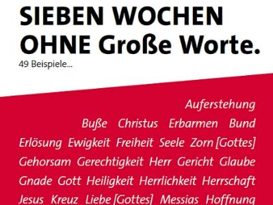 Die Aktion steht unter dem Motto „Sieben Wochen ohne große Worte“. Dazu heißt es auf der Internetseite http://www.ohne-grosse-worte.de/ : „Kaum eine Predigt kommt ohne Große Worte aus: Barmherzigkeit, Hoffnung, Kreuz … Manchmal funktionieren sie wie Platzhalter, aus denen die Inhalte längst ausgewandert sind. Die Predigtsprache gerinnt in Substantiven. Wie kann sie wieder lebendig, anschaulich und konkret werden?“